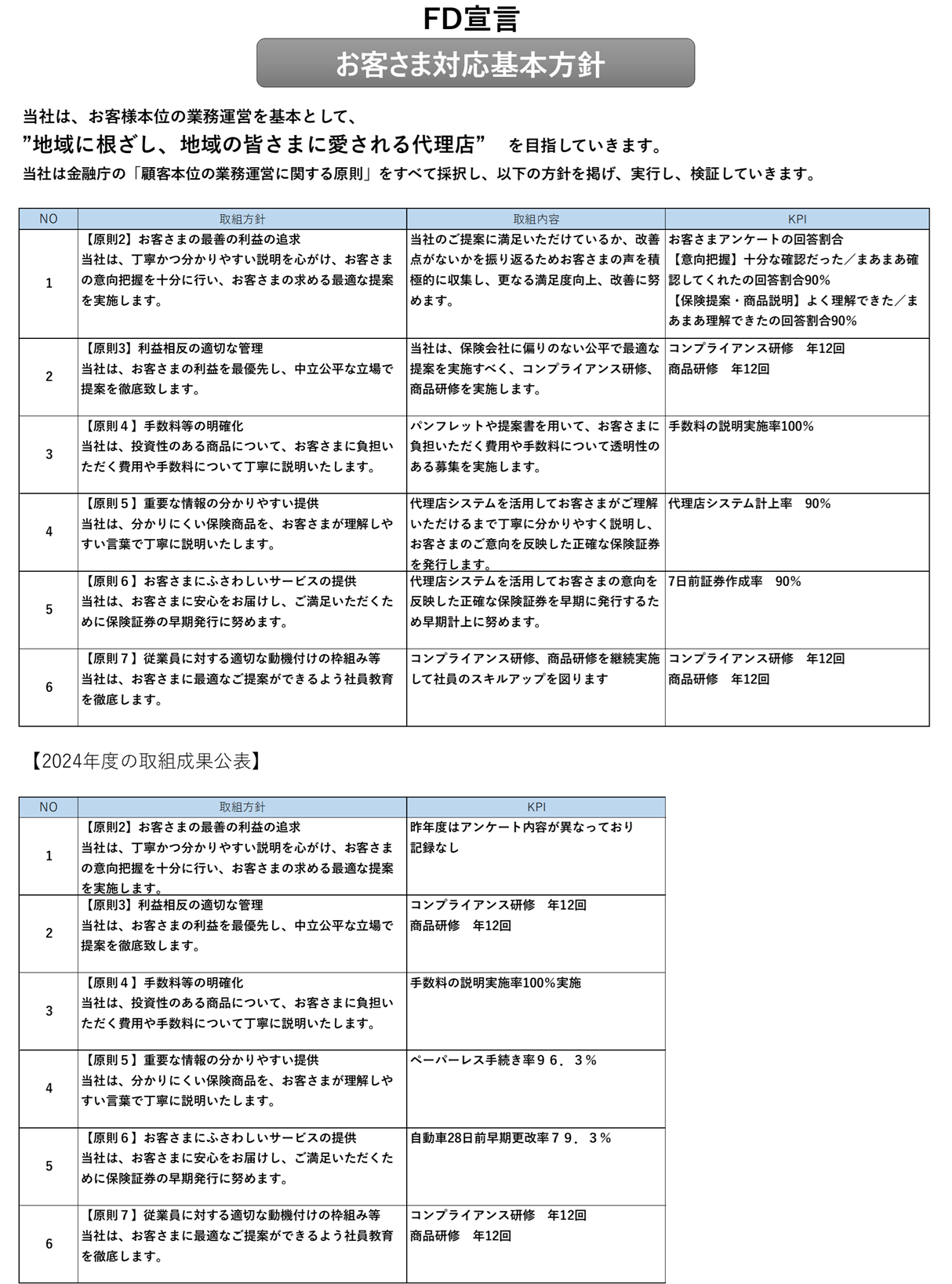 - 保険販売等においては、お客さまを取り巻くリスクの分析やコンサルティング活動等を通じて、お客さまの意向と実情に沿った適切な最大限配慮した商品設計、販売・勧誘活動を行ってまいります。